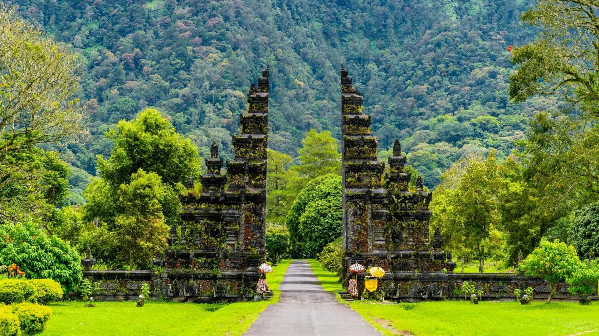 ประตูหินสไตล์ฮินดูที่เป็นสัญลักษณ์ของบาหลี ถ่ายรูปออกมาเหมือนอยู่ในเทพนิยาย
