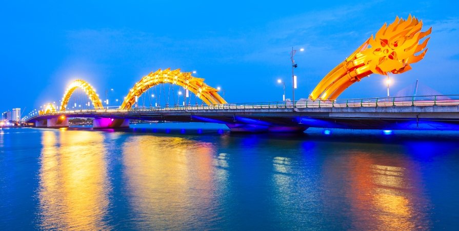 ที่เที่ยวดานัง ที่ไม่ควรพลาดเริ่มต้นที่สะพานมังกร สะพานประติมากรรมข้ามแม่น้ำฮันรูปมังกรสีทองตระการตา ตัวสะพานทอดยาวกว่า 666 เมตร เชื่อมต่อ 2 ฝั่งของเมือง นอกจากจะเป็นจุดชมวิวสวย ๆแล้ว ตอนกลางคืนยังมีไฟประดับตัวสะพานสวยงามน่าถ่ายรูป รวมถึงการแสดงมังกรพ่นไฟที่จัดขึ้นในวันหยุดสุดสัปดาห์ด้วย ถ้ามีโอกาสต้องไปเช็คอินที่นี่ให้ได้